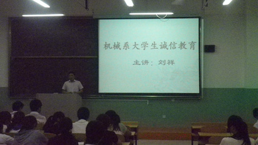 为帮助学生树立诚信意识、塑造诚信品质、按时履行助学贷款合同,机械系党总支、团总支于5月14日在107教室组织开展了以“大学生诚信教育”为主题的讲座,本次讲座由刘祥老师主讲。
