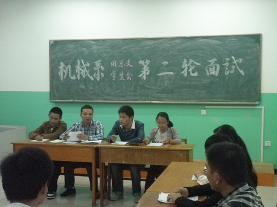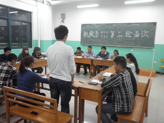 为做好新学年机械系的团学工作,机械系第十届学生会换届竞选面试于9月25日晚7:00在综合楼306教室如期举行,共有34名同学参加了竞选。系团总支书记刘祥老师及第九届学生会主席团成员组成本轮面试的评委。
